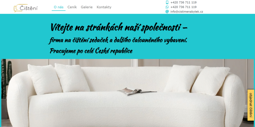 Розробка сайту для послуги з чищення меблів та побутових речей. Замовлення простого сайту з 3 сторінок в білому, блакитному та золотому кольорах.